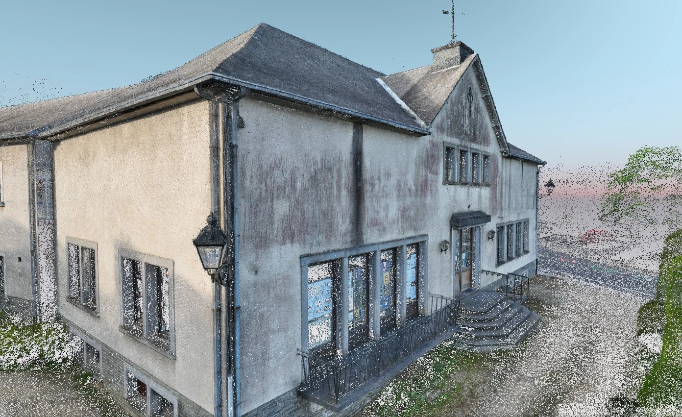 Génération d’un nuage de points haute densité par drone en vue de constituer le dossier de permis d’urbanisme pour une maison unifamiliale. Ce relevé permet une représentation précise du terrain et de son contexte, facilitant l’intégration du projet architectural dans son environnement.