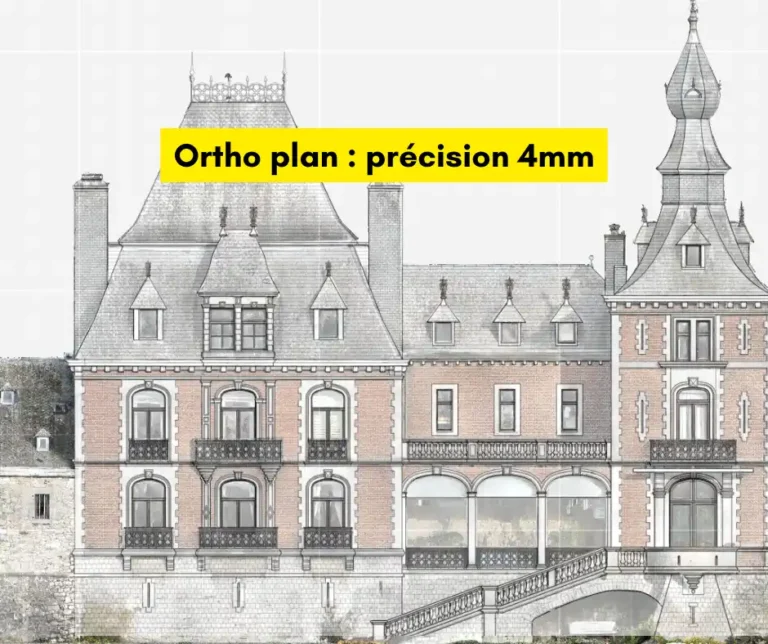 Réalisation d’un orthoplan haute résolution d’une façade de château, superposé au dessin architectural existant.