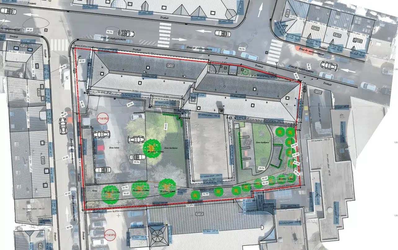 Lors d’un relevé de contrôle sur un site en préparation, nous avons superposé une orthophoto drone haute précision au plan d’architecte.